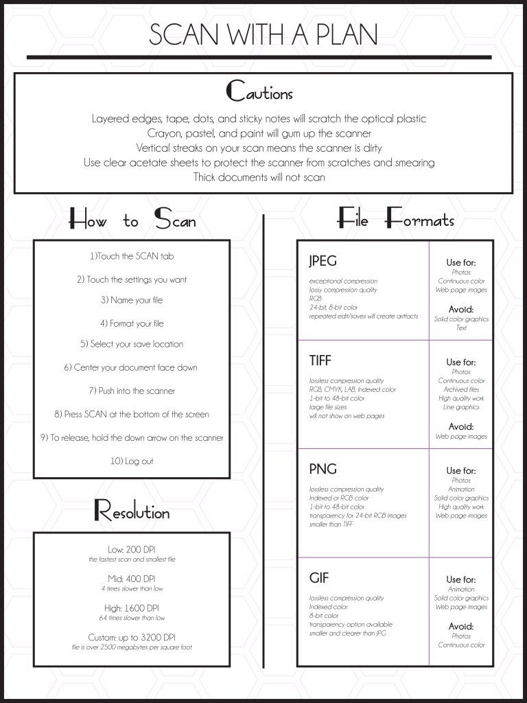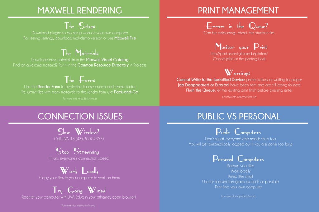 While working at the architecture school over the summer for the IT department, I was in charge of planning and designing a series of large scale posters. These were to assist students in their use of the school computers, equipment, and processes.