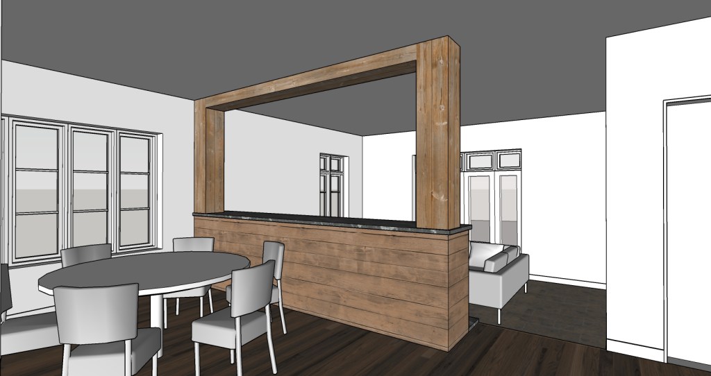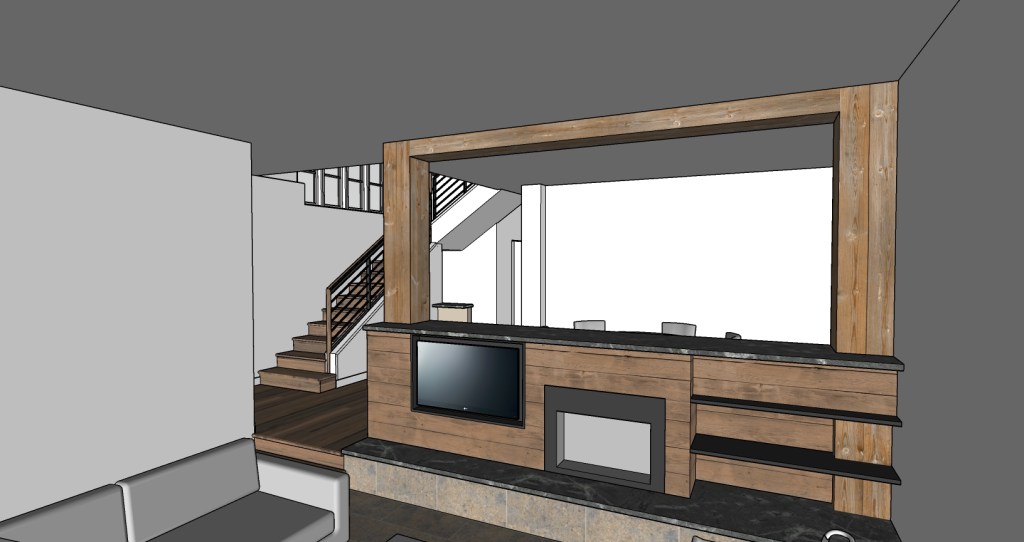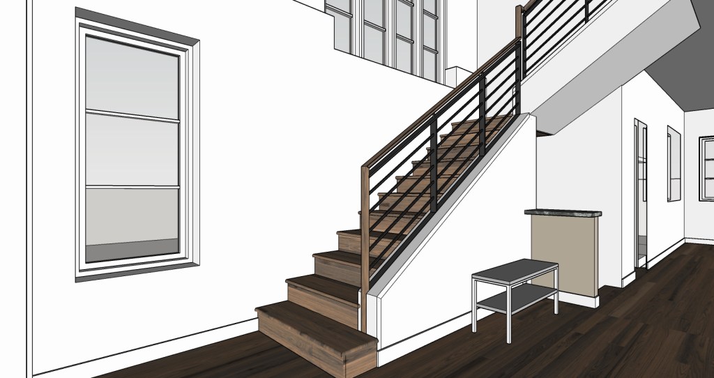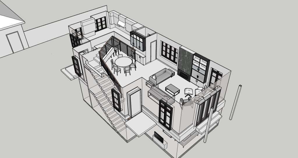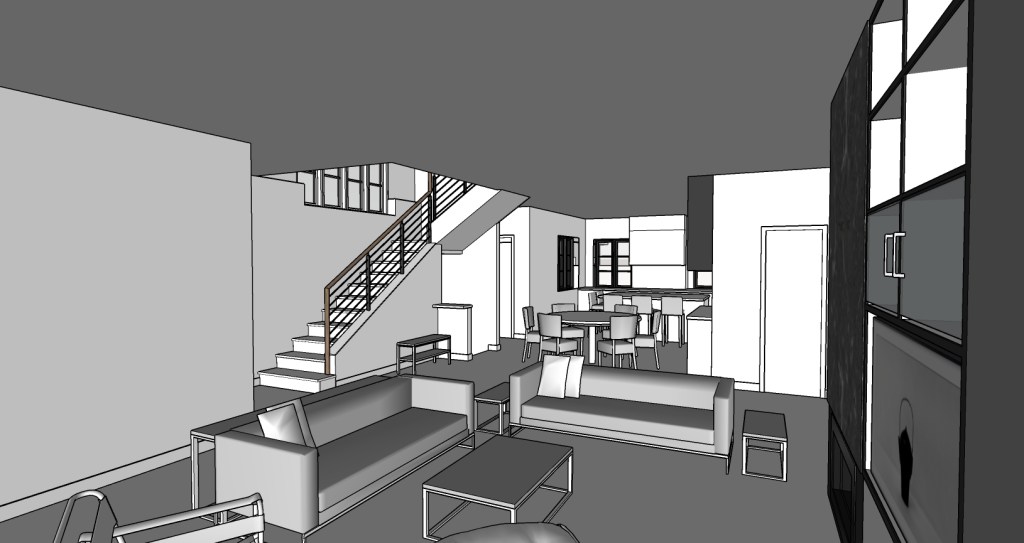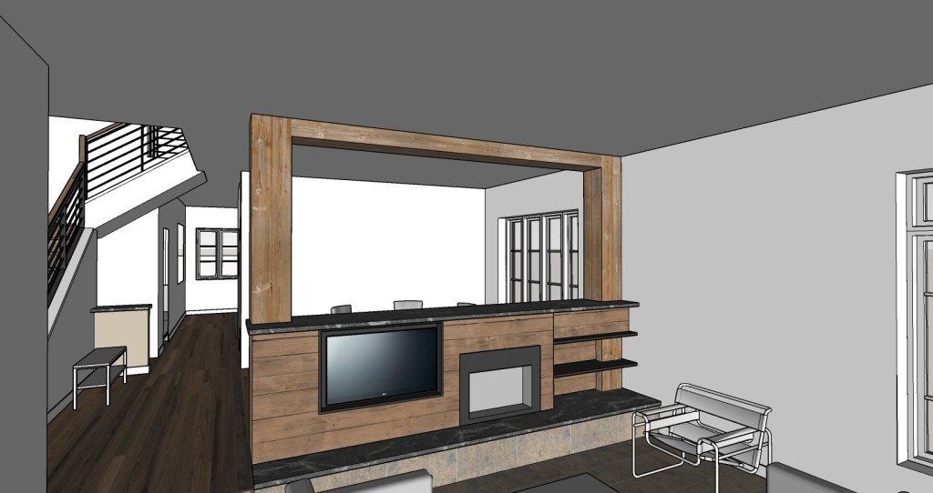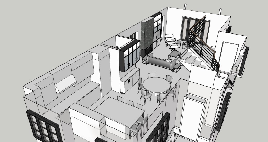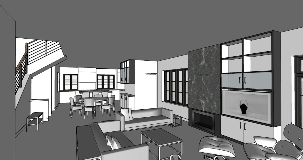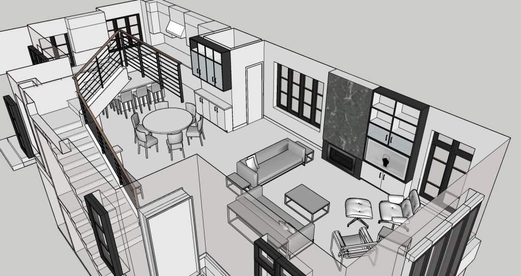 The interior remodel of this house consisted of removing the walls dividing the main floor, raising the floor in the living room to match the rest of the level, and designing a custom railing and fireplace. The project went through many iterations lead by the client that I was tasked with managing, modeling, and documenting. I measured the existing building and created the revit model from my measurements and historic drawings from the city.