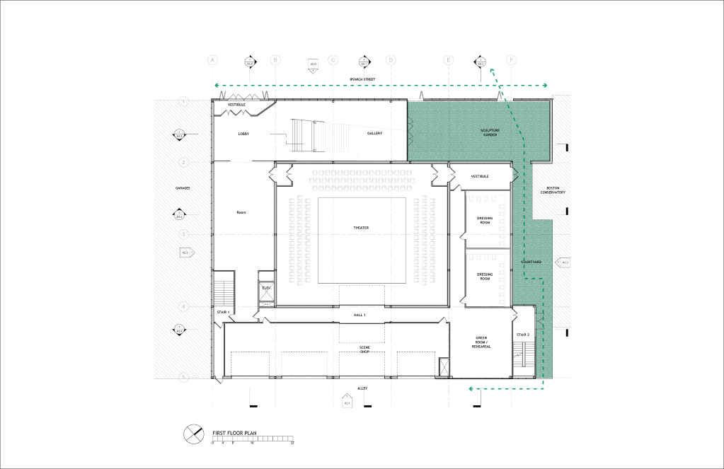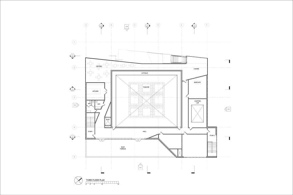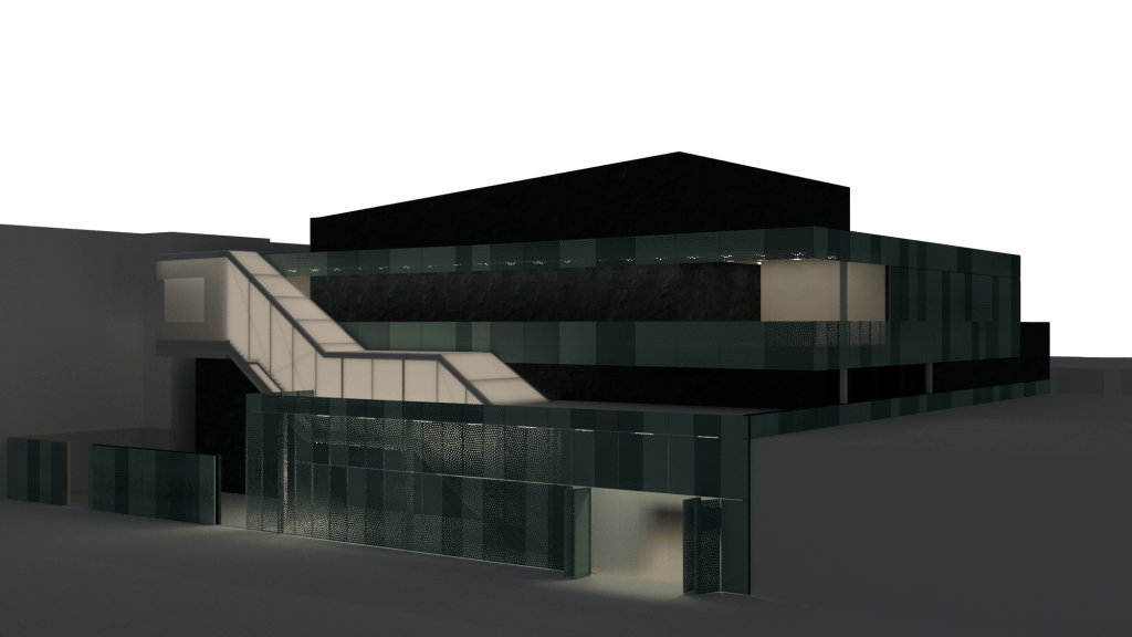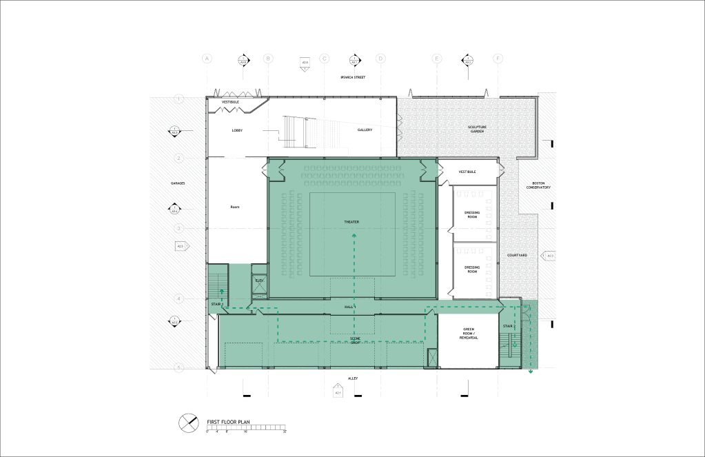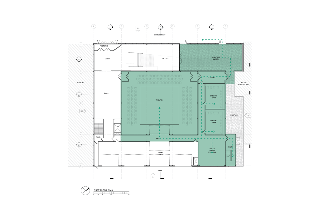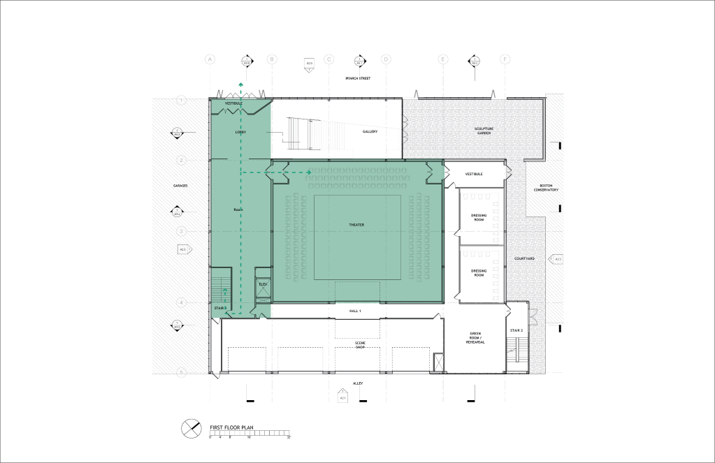 In this comprehensive studio, we designed a fully integrated black box theater in the Fenway neighborhood of Boston. The facilities included backstage production areas, theater spaces and acting resources, and a public facing lobby and recreation spaces. The goal of this studio was to dive into the detail work of particular aspects of our design. My project featured a monumental stair that rose multiple stories and transformed from interior to exterior. The stair served as a visual guide for the public, pulling them through the lobby space and up into the third floor café and restaurant spaces. The stair is sheathed in translucent polycarbonate so that it illuminates like a lantern at night to fit in with the vibrant nightlife of the area.