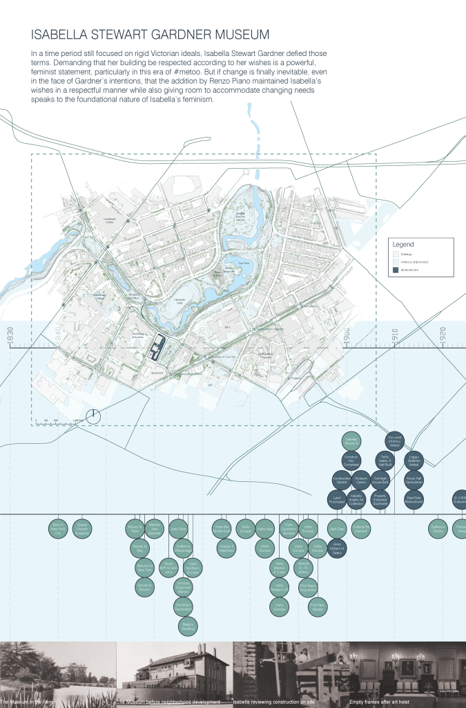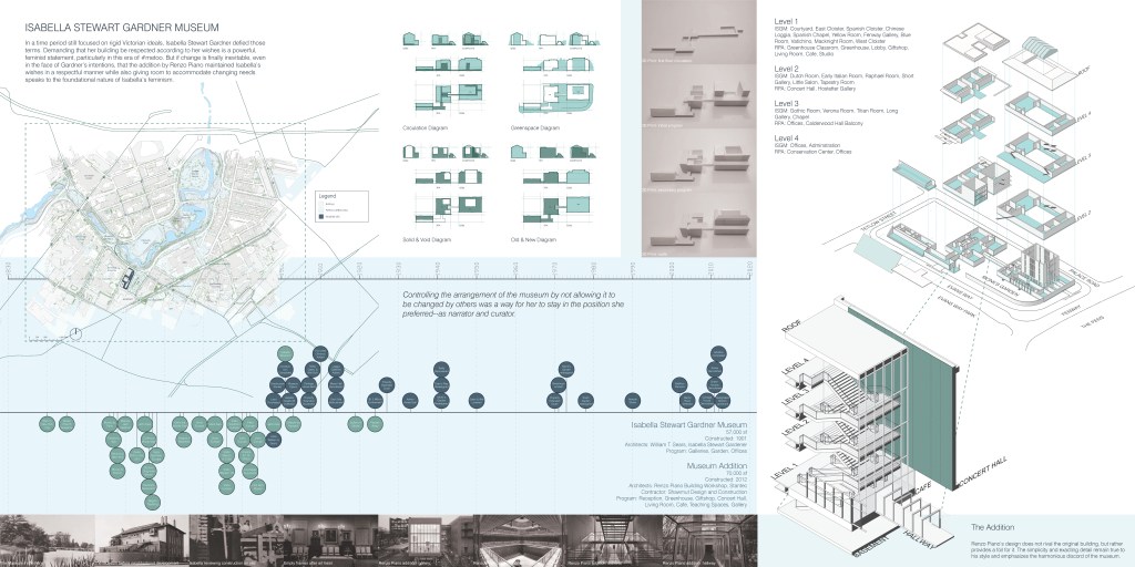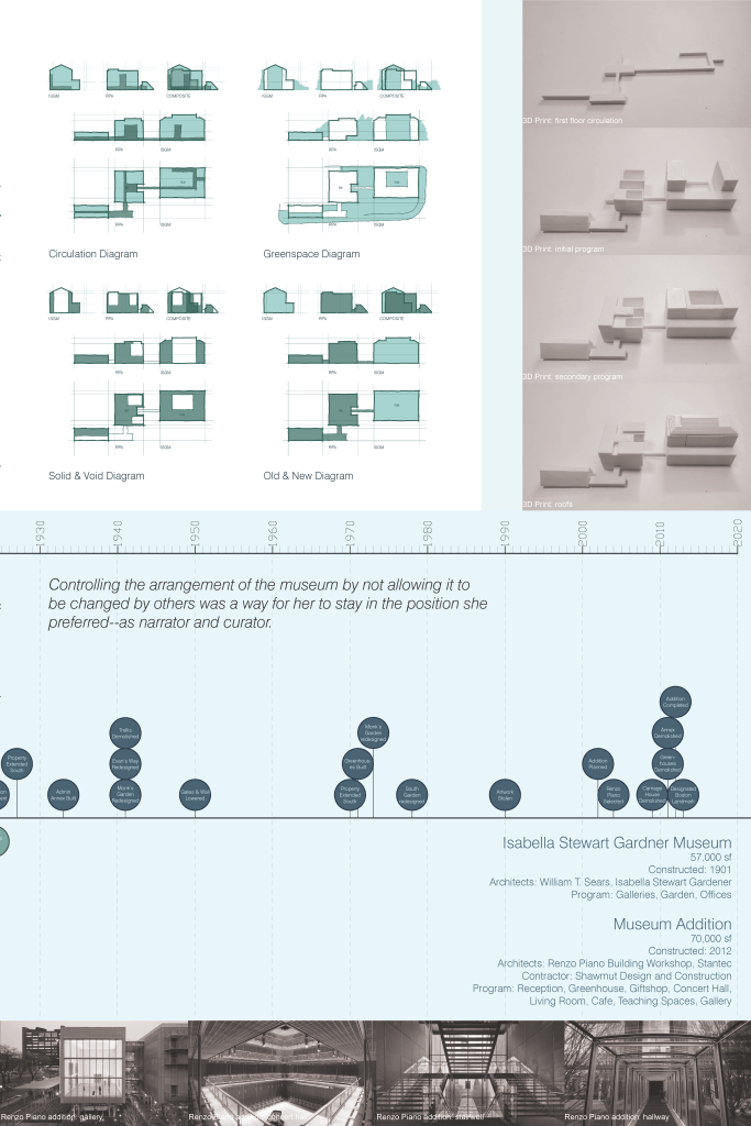 The project for my Design as Research class aimed to improve our understanding of the design process by researching, documenting, and analyzing an existing building by a notable architect in the Boston area. The building I chose was the Isabella Stewart Gardner Museum by Isabella Stewart Gardner with a new addition by Renzo Piano. We began by doing mapping studies and historic research. This work was followed by the development of massing models that we analyzed through various architectural properties. From the massing model, we honed in on the detail of the building through aperture and spatial division and then finally in tectonic detail on a particular aspect of the building.